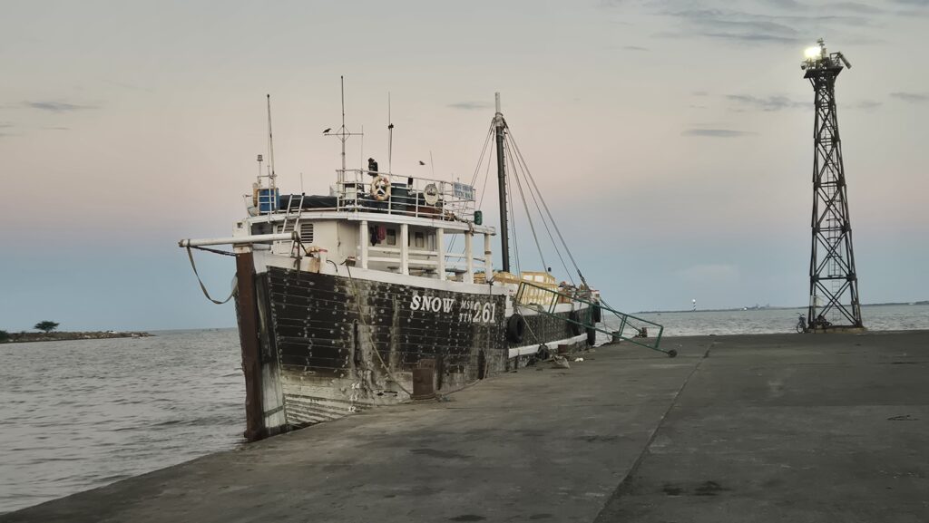 At first, his agent said that it would not be possible for us to get the pass, but then after a while, we were able to get the pass. And at around 5:30, his driver came to pick us up. On the way, Roshan Uncle came and he drove us to the port. I was surprised we were going to the port, because I still was not sure if they would let us through. But luckily, when we went there, they let us through. First of all, he just showed us nearby, like there were these other big cargo ships called barges that would take big rocks to the Maldives, because naturally, Maldives does not have big rocks, and they would need them for some of their big projects and infrastructure. And what seemed like such a small tug boat, is what would take that all the way to the Maldives. They were really high powered, yet they seemed so small.