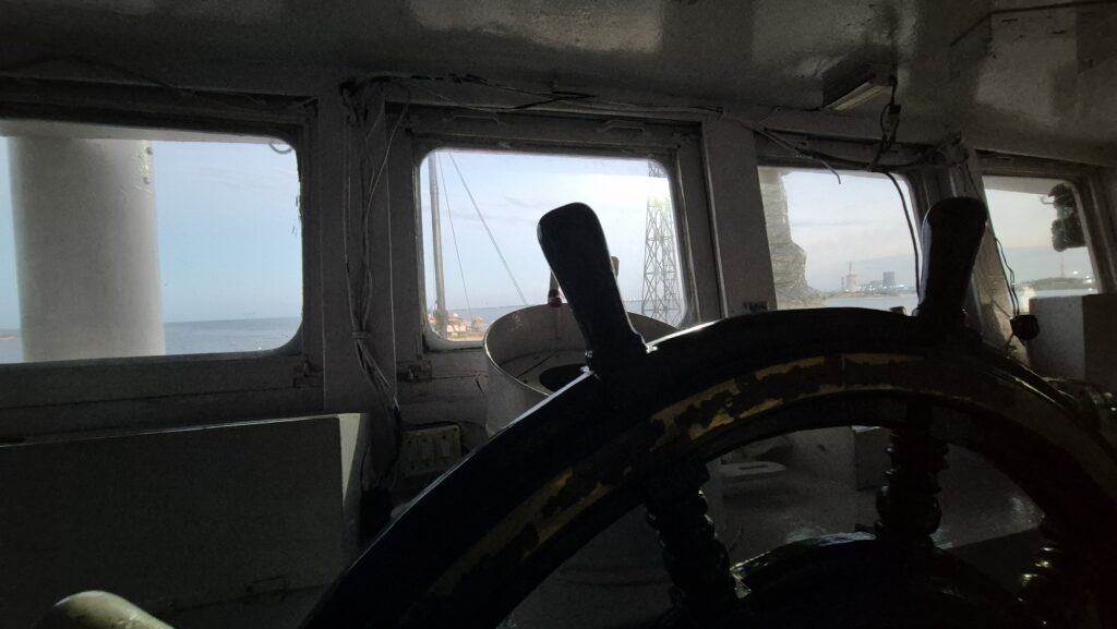 It was docked, and we were not going to be able to ride on it while it was moving of course, but it was still exciting. The scary part though, was getting on the boat itself, because to get on you need to go on a ladder that was a little unsteady, and below for a short distance was the sea, so it was scary for sure. But after we got on I felt better. We were able to get inside and see the control room of the boat. It was pretty cool, and I was even able to hold the helm of the boat, it was locked obviously. And at that moment I felt like Capt. Jerry. 😉