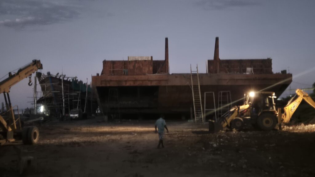 It was very fun going on the boat, after that, we went to the shipyard. The shipyard was where Roshan Uncle was building one of his ships, which I was excited about again. First, we saw a barge that was on the ground. When you saw the barge on the sea the height did not seem too big, but on the ground, it was extremely big. We took a walk around the shipyard, and he explained to us all about the ship he was building, that we also saw. He had to gather lots of big trees for his boats. And he has to go to auctions for them.