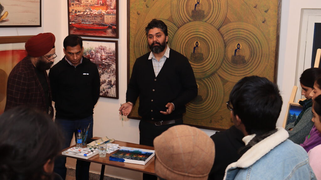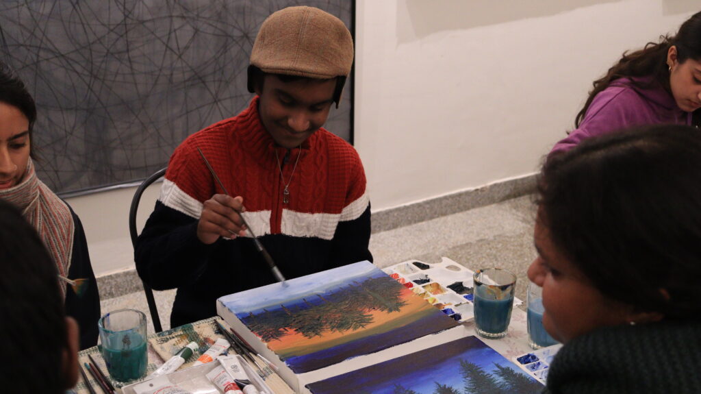 Dr. Pardeep Singh taught us how to create a simple scene of trees, snow, and a sunset. He first explained the basics of painting, like which brushes to use and why. Then he showed us how to build the base, which colors to choose, and the technique needed to apply them properly.